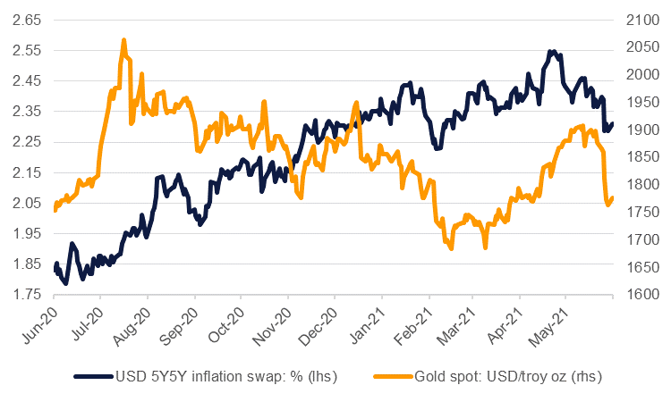 The apparent market acceptance of the Fed’s inflation narrative is damaging the near-term prospects for gold. With inflation only a 2021 phenomenon, at least for the US, then the benefits of holding gold as an inflation hedge weaken. Moreover, if the economy does perform in line with the Fed’s expectations—growth of 3.3% in 2022 and 2.4% in 2023—then long-term yields should move higher too and help to draw funds away from gold and back to US Treasuries. We also haven’t heard an assessment from the Fed yet about when they will begin their tapering of asset purchases. An announcement around the Jackson Hole central banking summit in August would seem likely and could set the market up for more dollar strength and gold weakness.