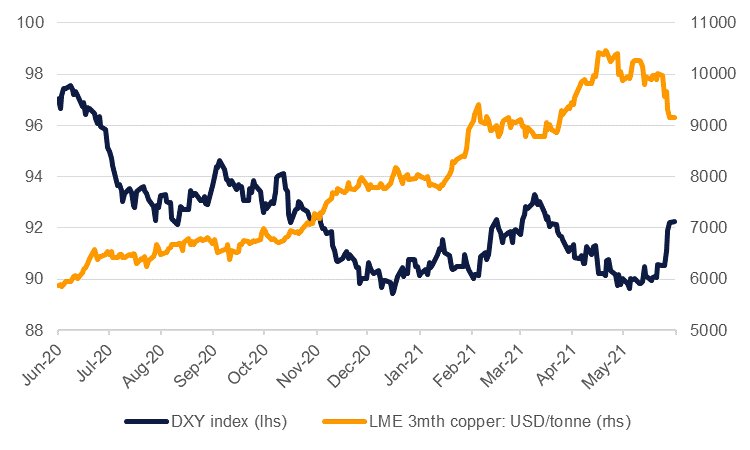 Metals prices have been hammered following the June 16 FOMC meeting where the Federal Reserve outlined the possibility of two rate hikes as early as 2023. Gold prices fell more than 6% over the course of the week and are holding now well below USD 1,800/troy oz on the spot price while LME copper fell almost 9% to close to USD 9,000/tonne. As markets adjust their inflation expectations post-Fed we would expect to see some divergence in the performance of metals over the coming months.