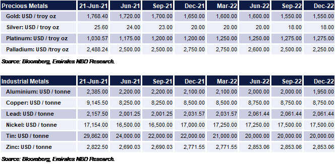 Our projection for gold prices in 2021 had been for them to weaken in line with a general rise in UST yields and a recovering economy. We are maintaining our expectations for gold to record an average of USD 1,700/troy oz in Q3 and USD 1,650/tory oz in Q4 with an annual average target of USD 1,717/troy oz. We expect the move lower in gold to bring silver lower as well and maintain our targets for an average of USD 23/troy oz and USD 20/troy oz in Q3 and Q4 respectively.