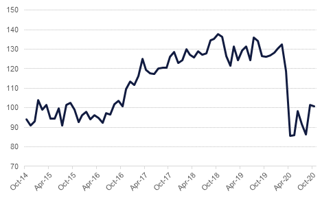 Durable goods orders in the US gained in September, rising almost 2% last month compared with just a 0.4% gain a month earlier. Core capital goods—stripping out aircraft and other high cost categories—also improved, rising by 1% m/m. Orders and shipments of capital goods rose as signs of industrial demand take hold. Manufacturing has managed to recover faster than services as economies globally deal with the Covid-19 pandemic, helping industry get close to pre-pandemic levels of output.