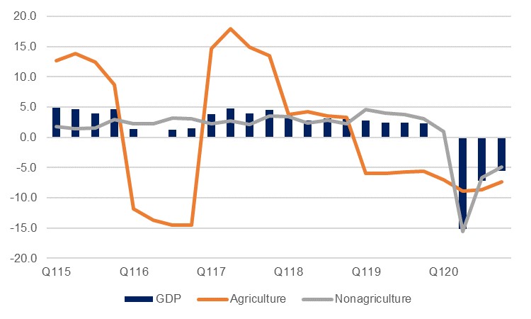 The Moroccan economy contracted by -7.0% in 2020 as it was impacted not only by the negative effects of the pandemic crisis, but also continued drought and resultant poor harvests. Regions of Morocco have had such little rain over the past two years that water from reservoirs intended for agriculture have had to be diverted to urban centres in order to ensure sufficient drinking water, and this has weighed heavily on the farming industry. Agriculture usually accounts for around 12.0% of Moroccan output, and as it has undergone eight consecutive quarters of negative y/y growth over the past two years, this has weighed on the Moroccan economy as a whole. Our headline growth forecast for Morocco is based in part on a recovery in the Moroccan agricultural sector, as even a return to the baseline average output prior to the past two years would imply growth of 7.0% compared to this year. However, there is of course by no means any guarantee that the drought will not extend for a third year, or that harvests will otherwise disappoint, in which case Morocco’s growth potential would be lower.