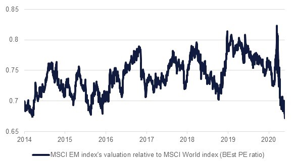 While global equities have recovered sharply from the lows of March 2020, gains have been uneven across markets. Developed market equities have led the rally with the MSCI G7 index trimming their year to date losses to -8.3%. In contrast, the MSCI EM index and the MSCI FM index are still down -16.5% ytd and -19.3% ytd. The outperformance can be put down to the ability of developed economies to spend their way out of the coronavirus pandemic, unlike emerging market economies. In fact, on a P/E ratio basis, the MSCI EM index is now trading at the deepest discount since 2014 to the MSCI World index.