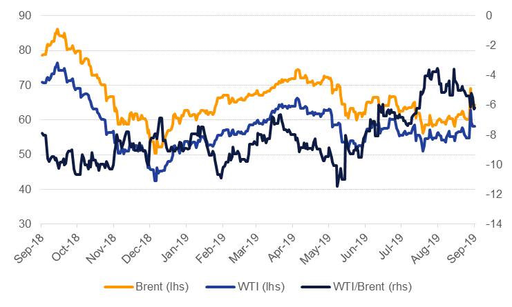 Oil markets remained on edge following the attacks on Saudi Aramco facilities last weekend and closed the week higher. Brent futures gained 6.7% over the week to settle at USD 64.28/b while WTI rose 5.9% to close at USD 58.09/b. The leadership of Saudi Arabia’s energy industry—the energy minister and Aramco officials—have been trying to reassure markets that supplies will remain stable and the enormous surge at the start of last week’s trading faded over the rest of the week.