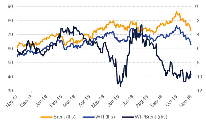 Beyond the waivers surveys of OPEC production pointed to strongly higher output in October. Reuters estimates show a monthly increase of 390k b/d largely down to sizeable jumps in output from the UAE (200k b/d), Libya (170k b/d) and Saudi Arabia (120k b/d). Given the sharp reversal in oil prices (including the front end of the Brent curve dipping into contango) along with weakening demand projections for 2019 a sustained increase in production from major OPEC producers can’t be taken for granted. Our view following on from the June OPEC meeting was that members would adjust production more responsively to short-term signals rather than seeking a fixed level of market share.