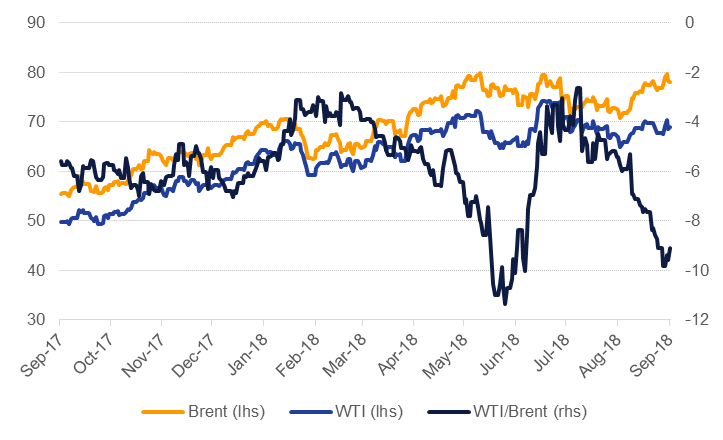 Forward curves highlighted the pending shortage in international markets. The backwardation in Brent markets continues to expand, hitting USD 0.87.b on the 1-3month spread while in WTI the spread closed the week at USD 0.32/b. There is a risk that WTI moves back into contango, at least in the front of the curve, but with a slowdown in production expected for 2019 the flip of the curve may not linger for too long.