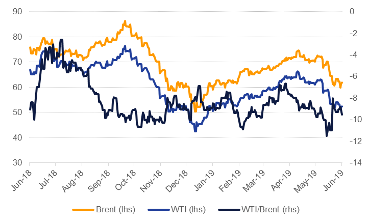 An elevated geopolitical atmosphere in the Middle East won’t help investor confidence if there is a perceived risk to security of oil supply coming out of the Gulf region. These recent attacks on tankers follow shortly on from attacks on tankers in Fujairah around a month ago. Oil production from countries using the Strait of Hormuz as an export route has declined by 1.47m b/d since the start of the year (according to Reuters data) as OPEC members restrain output and Iranian output is under US sanctions. OPEC reported that Iran’s production had fallen to 2.37m b/d in May, down 1.45m b/d from the same month in 2018, while exports were estimated at just 500k b/d in May. Importers of Iranian crude will likely continue to shun the country’s cargoes, helping to keep oil markets tight over the next few months.