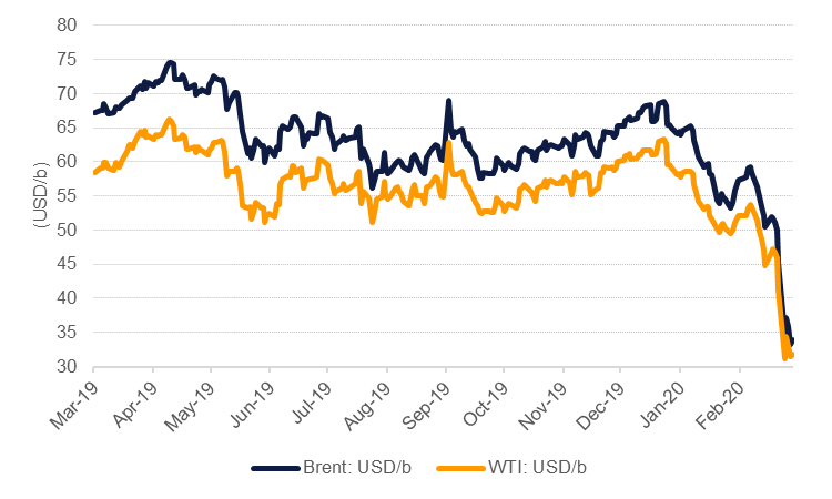 Oil markets collapsed last week under the weight of the Saudi-Russia price war, a complete exodus from risk assets and escalating panic over the spread of Covid19. Travel restrictions imposed by countries are now not a matter of if but when and who’s next. The US has announced a state of emergency, France and Spain have imposed lockdowns to try and control the spread of the virus and several additional countries have imposed border closures. We don’t think the dust has entirely settled yet but at the end of the week Brent futures closed at USD 33.85/b, down 25%, while WTI fell to USD 31.73/b, a drop of 23%. Both contracts recorded their largest weekly decline since the Global Financial Crisis.