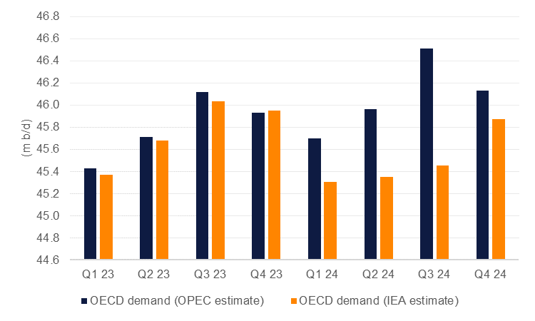 The IEA outlook for demand stands in sharp contrast with OPEC which projects another strong year in 2024. The producers’ alliance estimates that oil demand will grow by 2.3m b/d, mostly accounting for rising non-OECD demand but the major divergence between the two forecasting agencies lies in the outlook for OECD demand. OPEC expects OECD demand will accelerate in 2024 by almost 260k b/d while the IEA estimates a near equivalent sized decline in consumption. Slower economic activity across developed markets will limit investment and industrial appetite, weighing on oil consumption. A “soft landing” in many markets may dampen the slowdown somewhat but oil demand accelerating while economic output slows appears incongruous.