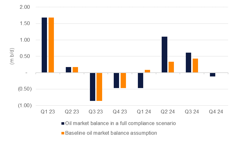 With some compliance with the Q1 voluntary cuts, oil markets will likely be close to balanced in Q1 compared with a draw of almost 500k b/d in a full compliance scenario. For the rest of the year we expect to see markets slightly over-supplied as OPEC+ and non-OPEC+ supply flows to market amid slower demand growth than in 2023.