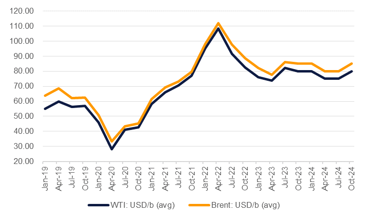 | WTI: USD/b | 72.02 | 75.99 | 73.67 | 82.22 | 80.00 | 77.97 | 80.00 | 75.00 | 75.00 | 80.00 | 77.50 |