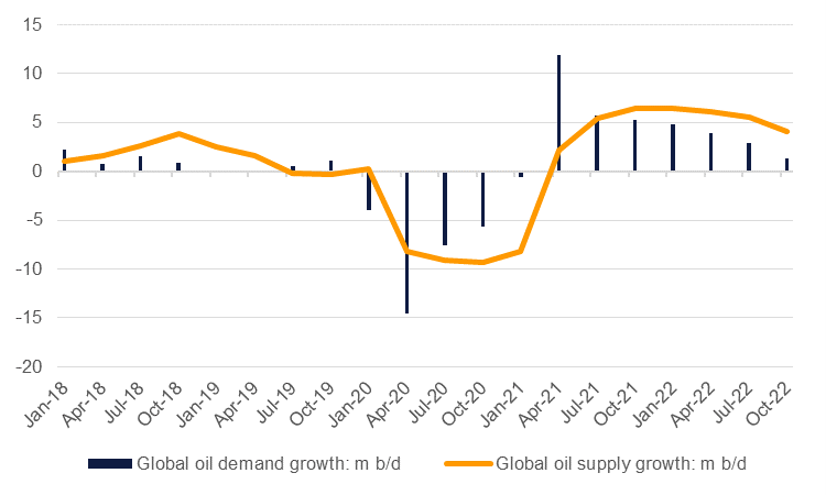 Our expectation now is that the OPEC+ countries that can hit their target levels will increase production, meaning upward revisions to our oil supply growth forecasts for Saudi Arabia, the UAE and a few others. So far there has been little movement from OPEC+ on making up the production shortfall from those that have missed targets and while we don’t think the producers’ bloc will endorse such a strategy there is nevertheless some upside risk to the supply outlook for the core Middle East OPEC countries.