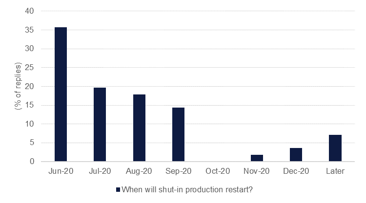 The dramatic decline in the US drilling rig count appears to have found a near-term floor with exploration and production companies only taking one rig out of operation last week with the total number levelling off a little below 200, mostly concentrated in the Permian in Texas. A survey from the Dallas Federal Reserve revealed that a majority of oil and gas companies expected to restart shut-in production by the end of July and that nearly 90% anticipated restarting output by the end of Q3. The survey was taken during a period when WTI prices were at an average of around USD 38/b on the front month—and not much higher further along the curve. A pending restart of US production at a time when OPEC+ has extended its deep cuts could undermine a significant level of the rebalancing underway in markets. Over the coming weeks results from US-focused oil companies should give a clearer indication of strategies for the rest of 2020, including their outlook on whether they can operate at the current low level of prices (the same Dallas Fed survey pointed out that companies expect to restart production at prices between USD 36-40/b).