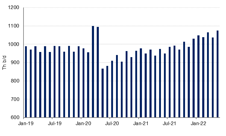Oman’s oil production has averaged 1.05mn b/d in the first five months of the year, achieving the target that the government had set out to reach by year end. Crude oil production in Jan-May is already 7.6% higher than 2021 production, and if the May level of output is maintained through the rest of the year, then full year oil production will be almost 9% higher than in 2021. As a result, we have revised up our forecast for 2022 oil and gas GDP growth to 7.0% from 5.0% previously. With non-oil sector growth also expected to accelerate to 3.3% this year from 2.2% in 2021, we now forecast headline GDP growth in Oman at 4.6%, up from 4.0% previously. This is broadly in line with the IMF’s 4.5% GDP growth forecast, published at the end of a staff visit in June. However, if Oman continues to boost oil production through H2 2022, there are upside risks to this growth outlook.