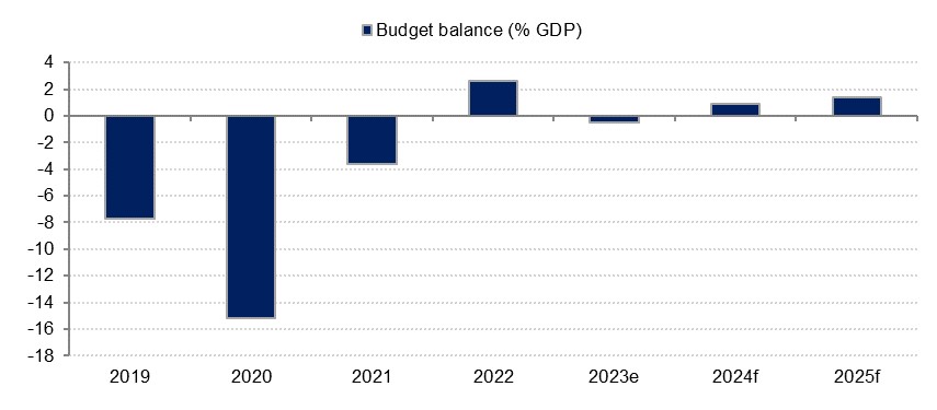 With oil production constrained, and prices likely to average similar to those last year, Oman’s government revenues from oil will see only modest growth, but higher natural gas revenues and an increasingly diversified tax base (VAT was introduced in 2021) will cushion the impact. Meanwhile, we anticipate that expenditure will remain flat, meaning a fiscal surplus equivalent to 0.9% of GDP this year, compared with our estimate of a modest -0.5% deficit in 2023 and a surplus of 7.3% in 2022. A reversal from the period of consecutive fiscal deficits has enabled Oman to reduce its government debt to 38% of GDP in 2023 according to ratings agency S&P, down from around 70.0% in 2020. This improved fiscal position has been recognized by the major ratings agencies, with Fitch, S&P, and Moody’s all upgrading Oman’s score in the second half of last year.