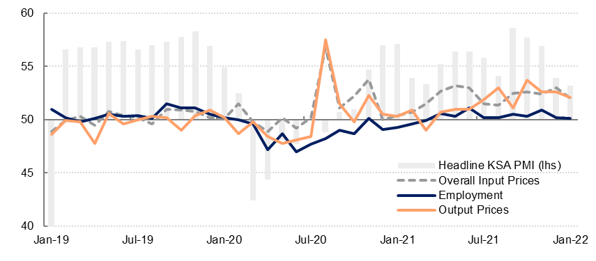 As in the UAE, private sector firms in KSA reported higher input costs in January, but unlike in the UAE, firms in Saudi Arabia have been able to pass on most of these higher purchase costs to buyers. Selling prices have increased broadly in-line with input costs in recent months.