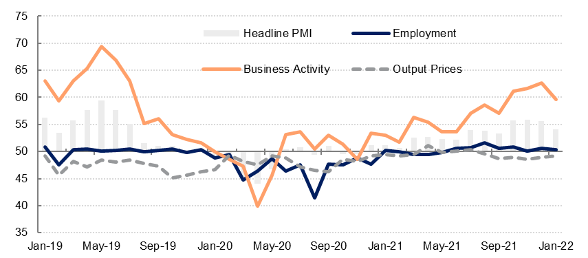 Output contracted at the fastest pace since mid-2020 in January as construction and wholesale & retail trade shrank, but services managed to expand. New orders also fell at the fastest pace since June 2020, with domestic orders seemingly leading this given that export orders recorded a positive expansion, albeit at a much slower pace than seen in December. Respondents to the survey continued to cite problems around shipping and higher prices as disrupting their external trade.