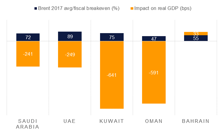 The strategy from OPEC+ (OPEC members plus partners like Russia, Kazakhstan and Mexico among others) since 2016 has been to forgo a market share battle with alternative producers like the US shale patch and instead focus on draining excess inventories and pushing prices closer to fiscal breakeven levels, particularly for OPEC members from the GCC. Cutting production is a heavy-handed tool which directly impacts GDP performance in OPEC+ economies given their dependence on oil production to fuel growth. In 2017 when Saudi Arabia cut oil production by 4.4%, the delta in real GDP growth was -240bps. In producers with less diversified economies the impact on growth was even more significant (see chart below).