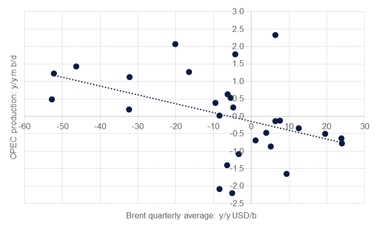 The direct impact from production changes on oil prices also appears to be concentrated during periods of market fixation on supply issues. From 2014-18—the period when oil prices crashed and OPEC adopted several strategies to deal with the collapse—there is a distinct, if limited, relationship between increases in output and lower prices (and vice versa). As the market is increasingly moving off non-supply related issues (eg trade war concerns, outlook for Fed rates) this relationship may start to weaken. Indeed, over a longer run period there is little discernible pattern from OPEC production levels and changes in benchmark prices.