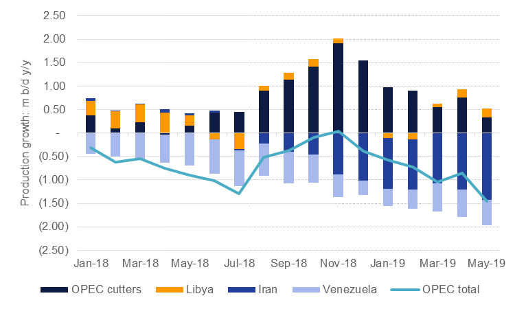Oil market balances will also remain subject to sanctions on major producers. Both Iran and Venezuela face US sanctions on their oil industries which are helping to tighten heavy, sour crude supplies in particular. On a y/y basis, Iran and Venezuela have been responsible for most of the decline in OPEC production in 2019 so far while members that are subject to cuts have actually supplied more oil than they did in 2018. The political position of the US remains hostile toward both Iran and Venezuela but the mercurial nature of the Trump administration’s foreign policy could see attitudes change quickly. Hence, while sanctions have done much of the work to tighten markets this year they are an unreliable variable to depend on.