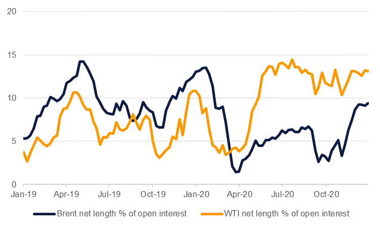 Oil prices did manage a strong rally in the final months of 2020 as the market cheered the advent of Covid-19 vaccines bringing an end to pandemic-induced economic lethargy. But the impact of vaccines is now well and truly priced into the oil market, taking spot Brent only up to current levels in the low USD 50/b range. Markets appear to be discounting downside risk to flat prices with put volatilities in both Brent and WTI well off 2020 peaks (not surprising given markets did record negative WTI prices in April last year). Moreover, speculative positions are relatively optimistic with net length holding around 9% and 13% of total open interest for Brent and WTI futures respectively. Any breakdown in oil market diplomacy could up-end markets substantially and quickly.