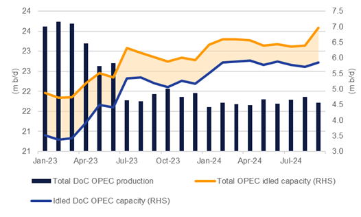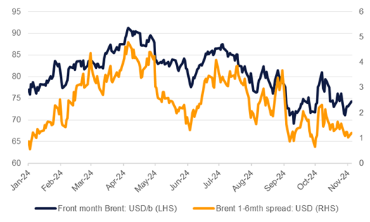 Conditions in oil markets clearly are not favourable for a substantial increase in production from OPEC+. Front month Brent futures have dropped from more than USD 87/b in early July to less than USD 75/b by early November and have traded as low as USD 69/b as anxieties over demand come to the fore. There have been brief pushes higher in prices in the intervening weeks as markets respond to concerns that critical global energy infrastructure could be caught up in regional geopolitics. But as it has become clear that shipments and production have been unaffected, the geopolitical premium in oil prices has deflated quickly, leaving the market to focus on fundamentals. Time spreads, which remain in backwardation, have also narrowed considerably as markets price in looser conditions.