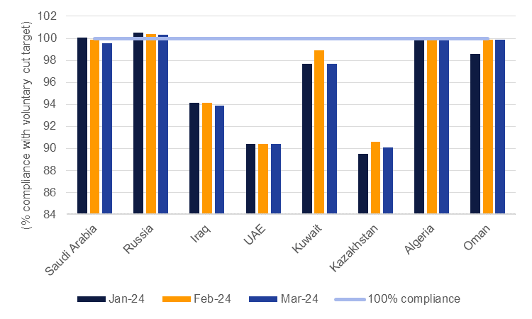 But as ever with production targets, compliance is key. Adherence to target levels has been generally good over the last six months although it has started to slip since the start of 2024. Among large producers in OPEC+, Kazakhstan, Iraq and the UAE have missed their targets this year. OPEC has indicated that it has received compensation plans from both Iraq and Kazakhstan to adjust their production levels over the rest of 2024 to “make up” for over-production relative to target levels. An extension of the voluntary cuts would be a supportive message for oil markets but low compliance to those cuts risks underwhelming the impact.