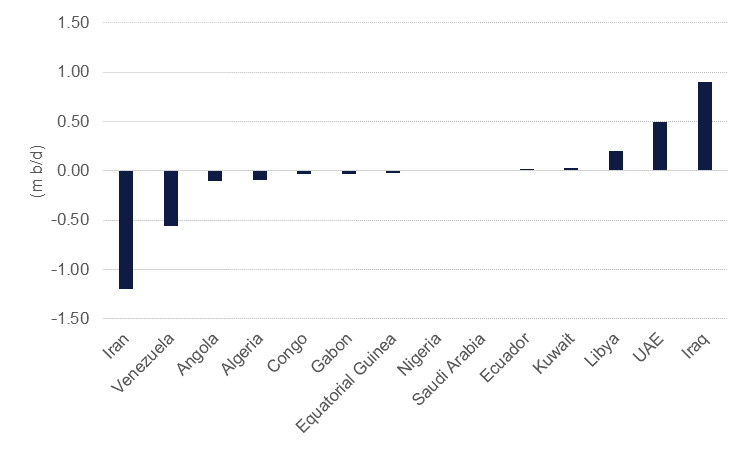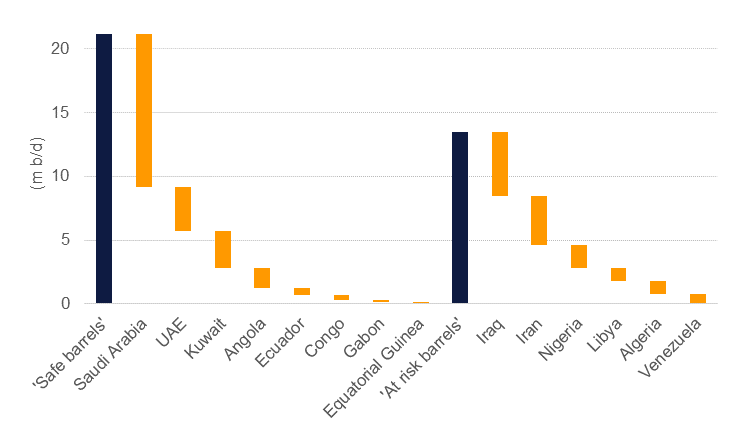 The IEA estimates that OPEC’s total capacity in 2019 is around 34.6m b/d with Saudi Arabia controlling the largest share (roughly 35% of the total). Of that 34.6m b/d total, roughly 61% are unencumbered by political risk. That leaves almost 40% of OPEC’s total output at risk. Iraq holds the largest share of these barrels at an estimated 5m b/d of capacity. While militant groups in the country have largely been defeated the risk of a flare-up is not zero and persistent debate between the central government and KRG over revenue allocation hangs over the country’s outlook.