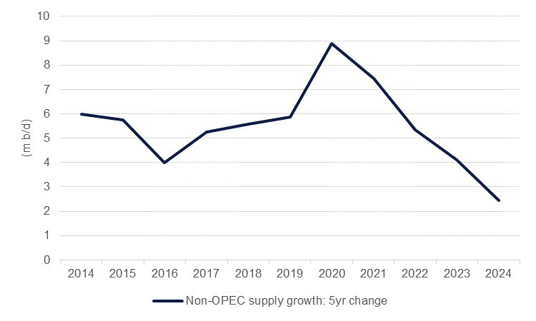 By the end of the 2018-24 period, however, the long-term (five-year) pace of growth in non-OPEC supply will have slowed from recent highs as the impact of the shale boom accrues into the base.