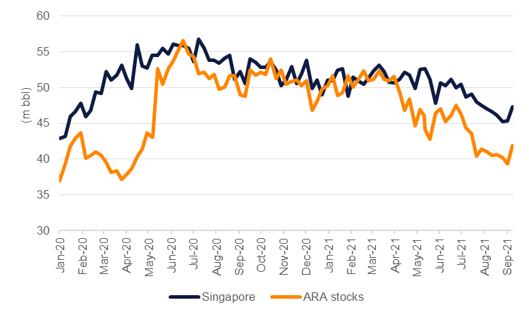 The improvement in demand this year has helped to erode the enormous build in stockpiles that accrued in H1 2020 when global mobility halted and oil demand collapsed. The IEA estimates that OECD stocks hit 2.88bn bbl in Q2 2021, around their level at the end of 2019 and more than 330m bbl below their peak level in Q2 2020. We estimate that OECD stocks will come in at an average of 64 days’ worth of OECD demand in 2021, substantially lower than the average of 75 days hit in 2020. In recent weeks, governments have taken steps to further unload inventories to help dampen down local fuel prices (as in the case of China) or offset the impact of hurricane-disrupted production (in the US). At major trading hubs stocks are drawing as well and are near their levels prior to the start of the pandemic with both Amsterdam/Rotterdam/Antwerp and Singapore storage draining in Q3.