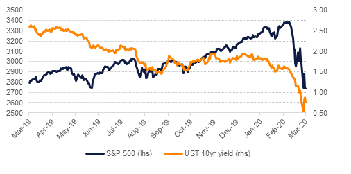 The WHO has declared that Covid19 is now a pandemic, adding to the sense of panic in markets. Governments around the world continue to take unprecedented steps to try and contain the virus: US President Donald Trump has announced that travel from Europe to the US would be suspended for the next 30 days—apart from the UK—to try and stop the transmission via travelers. Regionally, Kuwait has essentially closed the country to international travel and imposed a two-week mandatory holiday top prevent the spread of the virus. Markets are hardly showing any signs of being reassured by these heavy handed steps with equity markets continuing to collapse—S&P futures are already down more than 4% after a near 5% decline in the index overnight—and yields on 10yr USTs are down 11bps in early trading today, wiping out a substantial portion of yesterday’s gains.