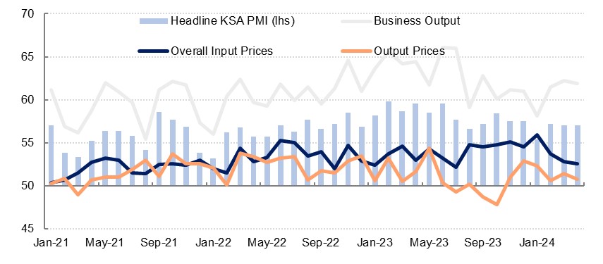 Price pressures eased in April after having risen at the start of the year, and input costs slowed to the lowest level since August. Staff costs rose moderately as firms noted cost-of-living pressures, but purchase price pressures softened and rose at the softest pace since July. Firms continued to pass on some of these price rises to customers, but output prices rose at a slower pace than in March, and some firms cut prices as they looked to remain competitive. CPI inflation in Saudi Arabia was at 1.7% y/y in March, down from 1.8% in February.