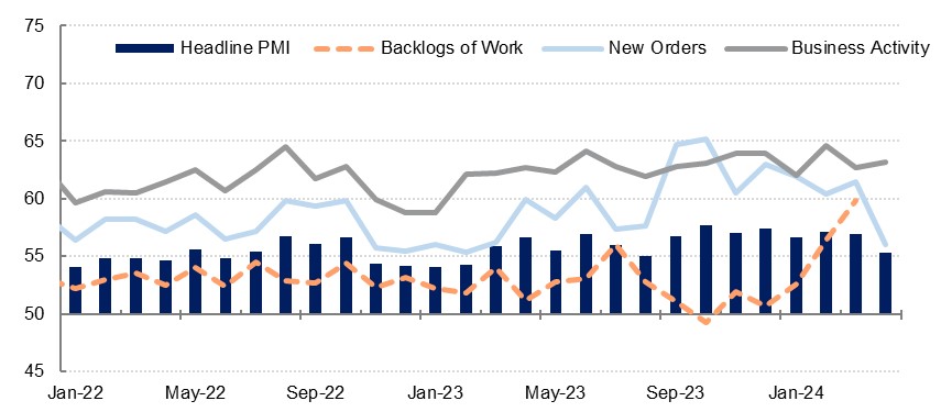Backlogs of work continued to expand rapidly, even if at a slightly softer pace than seen in March. Strong order growth has explained part of the uptick, but businesses also cited the storms as disrupting work in April, following on from the disruption to Red Sea shipping noted as a cause in recent months. Purchase costs rose again after dipping in March, with higher raw materials prices driving the increase. Staff costs also ticked higher as businesses compensated workers’ higher costs of living.