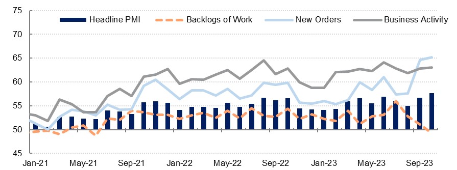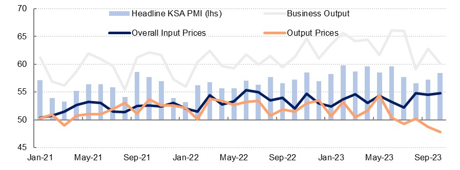 Despite the growth in new orders, business optimism declined in October. Firms have previously cited growing competition as weighing on the outlook, but the overall view remains positive. The start to the fourth quarter chimes with our non-oil GDP growth forecast of 5.0% this year, similar to that seen in 2022.