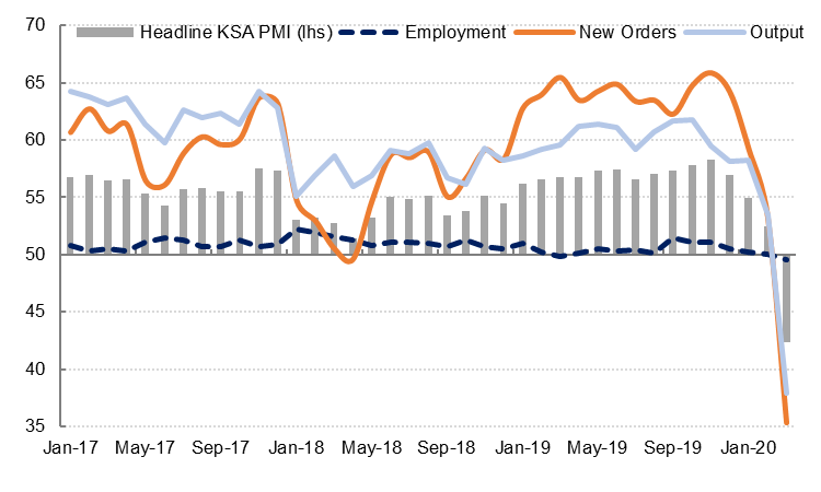 Saudi Arabia’s headline PMI fell more than 10 points in March to 42.2, a record low and the first sub-50 reading for the kingdom’s PMI in more than 10 years of data. Both output and new work contracted sharply as businesses were closed and projects delayed as a result of restrictions imposed by the authorities to limit the spread of COVID-19. However, unlike in the UAE, private sector employment was only fractionally lower (49.6) last month.