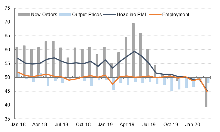 Perhaps most tellingly, the pandemic has induced a bout of pessimism in the survey respondents not seen before; the future output sub-index fell to a series low in March, as they cited concerns over the economic conditions. While still above the neutral 50.0 line, it marked the third consecutive month of falls.