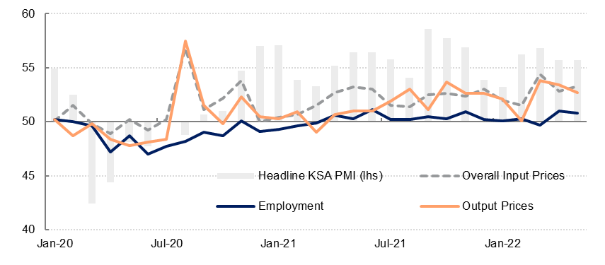 Saudi Arabia’s PMI was unchanged at 55.7 in May with business activity, new work and employment rising at a similar rate as in April. Businesses reported strong demand as the economy continued to recover from the pandemic. Firms slowed their purchasing activity last month however, as input costs rose slightly even as supplier delivery times improved. Panellists reported higher raw material, freight and fuel costs in May, but were able to pass some of this on to consumers. Selling prices in May rose for the fourteenth consecutive month, albeit at a slower rate than in March and April.