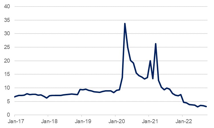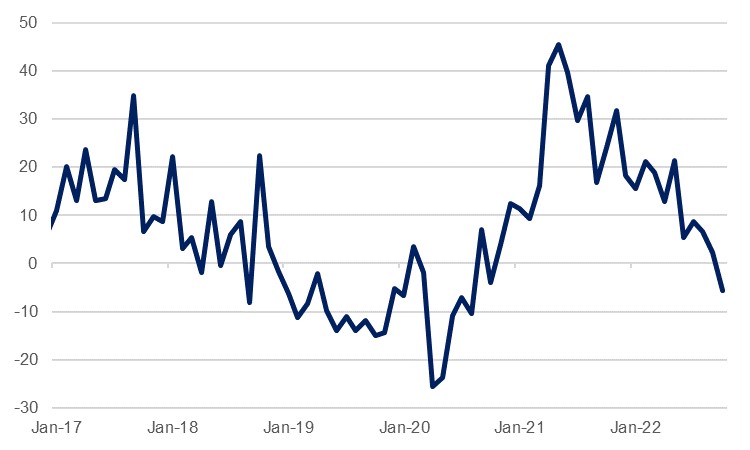 While there has been a slowdown, developed market consumer spending has arguably held up comparatively well through most of the year even as incomes have been eroded. This is thanks in part to savings accrued through the pandemic period when opportunities to spend – on travel and activities at least – were more limited. Helicopter money payments to households also boosted household savings and US personal savings as a percentage of disposable income averaged 17.1% in 2020, compared to the five-year average of 9.9%. However, at the latest print for September, this had fallen to 3.1%, which barring the 3.0% seen in June was the lowest level since the global financial crisis in 2008. The Federal Reserve estimated in October that lower income households still had excess savings of some USD 5,500 but expected that this would ‘continue dwindling rapidly’ in the following months. Meanwhile, German households deposited an excess of around EUR 73bn in banks through the pandemic period according to the IFO, but these have already been eroded over the subsequent quarters. These savings that helped cushion households through the past several months of wage erosion are being taken out of the equation, meaning that consumers will steadily become more circumspect with regards their spending, weighing on global demand.