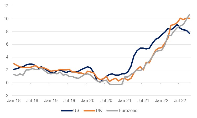 Recent Q3 growth results for the US, Eurozone and UK all surprised to the upside, and the anticipated slowdown in the global economy has not manifested in the data as quickly as expected in many respects. Nevertheless, there were already signs within the backward-looking growth figures that consumer demand was starting to come under pressure, and the outlook through the final months of the year and into 2023 is clouding over further. Even for those markets that do not see economic contractions, growth will be weak in the coming quarters as high inflation, and central banks’ responses to that, start to weigh more meaningfully on demand. The IMF stopped short of predicting a global recession next year in its latest October WEO, predicting growth of 2.7%, but it did give a one-in-four chance of sub 2.0% growth and the downside risks appear to outweigh any chance of further positive upside surprises – a ‘growth recession’ appears to be the best outcome for developed markets to hope for as things stand.