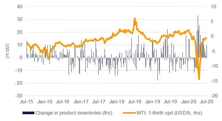 Oil curves turned decidedly downward last week with the contango in both the Brent and WTI markets widening across the curve. Front-month spreads both settled at around USD 0.22/b for 1-2 month contracts while December spreads are pushing back to a USD 2/b contango. While crude inventories have shown some weeks of sizeable draws, product inventories remain bloated. In the US product stocks have risen every week barring one since late March with the average weekly build at over 12m bbl during that period. Forward curves will struggle to push into backwardation while the level of product stocks remains so burdensome and any surge upward may prove a tempting profit taking opportunity for investors still taking a relatively large amount of long speculative positions (see charts below).