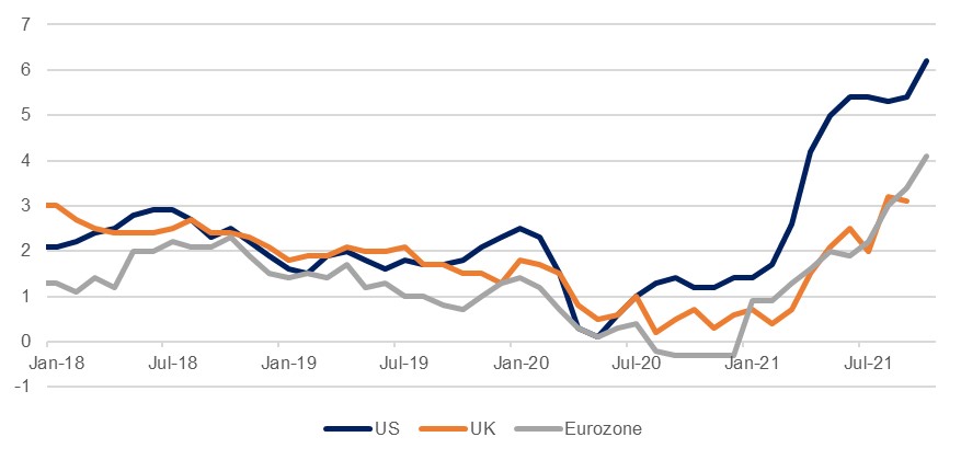 US inflation ticked higher again in October, with price growth hitting 6.2% y/y (from 5.4% in September), and 0.9% m/m. This exceeded projections of 5.9%, with much of the upward pressure coming from higher energy prices, which contributed around a third to the price gains. That being said, core inflation also ticked higher with reopening frictions and supply chain issues still in play; vehicles prices, both new and used, were a major driver. CPI inflation in the eurozone hit 4.1% y/y in October, compared to 3.4% in September, while in the UK it is expected to accelerate to 3.9% (from 3.1% in September) when the data is released this week.
