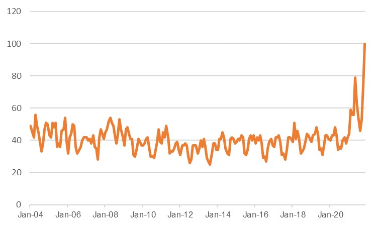 As long as price growth remains at these higher levels, however, the greater risk it poses to the global recovery, especially as households become more concerned around the potential impact on their finances and maybe cut back on spending as a result. Inflation is starting to percolate into the popular imagination more forcefully in recent months, as evidenced by Google trends data (which tracks the instances of particular search terms). For the US, France and Germany, the (incomplete) November data shows a surge in searches on inflation to record highs, while those in the UK are also higher compared to trend. Media stories around price growth and higher costs for everything from taxis to groceries have become commonplace, and while the use of the word inflation in books had fallen almost every year from its late-70s peak to 2019, it will almost certainly have picked up once more. The more media coverage there is around inflation, the more concerned about it people become, and this has implications for the recovery.
