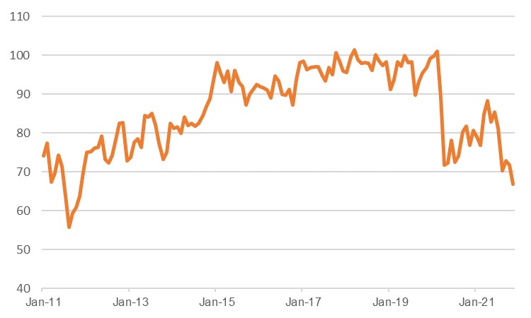 This was underscored last week by the release of the US University of Michigan Consumer Sentiment Index which surprised sharply to the downside in November, falling from 71.7 the previous month to just 66.8. Not only was this the lowest reading in a decade, it was also the biggest spread between expectations and reality in the past eight years by some margin. According to the survey’s director, Richard Curtin, a quarter of respondents ‘cited inflationary reductions in their living standards in November’. This has significant implications for US growth, as in the third quarter and in recent months the constraint on the US economy has largely come from the supply side, with the ships and chips issues weighing on production, in particular in the automotive sector. Our US macro scorecard for September showed a clear disparity between the demand and the production side of the economy (see US macro scorecard - September). Should this start to falter, and demand weaken significantly also, then present growth projections may prove too bullish.