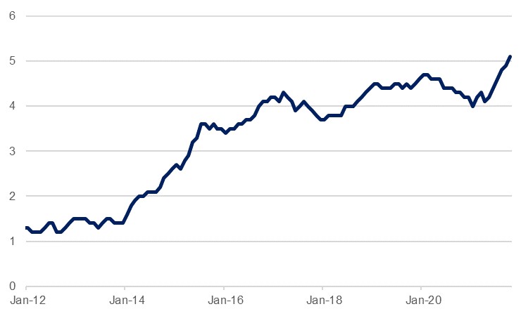 While we are in agreement with developed market central banks that the current high levels of inflation will ease (see High inflation leaves Fed with few good options), there is growing evidence that concerns over mounting price pressures are taking greater hold over the public’s imagination. This runs the risk of both perpetuating an inflationary spiral should it translate into greater demand for higher wages, but also derailing the global economic recovery through hitting demand. While supply chain issues and their impact on production have held back global economic growth to now, demand has remained fairly robust. Should this start to waver, then the pace of the ongoing recovery from the pandemic would slow.