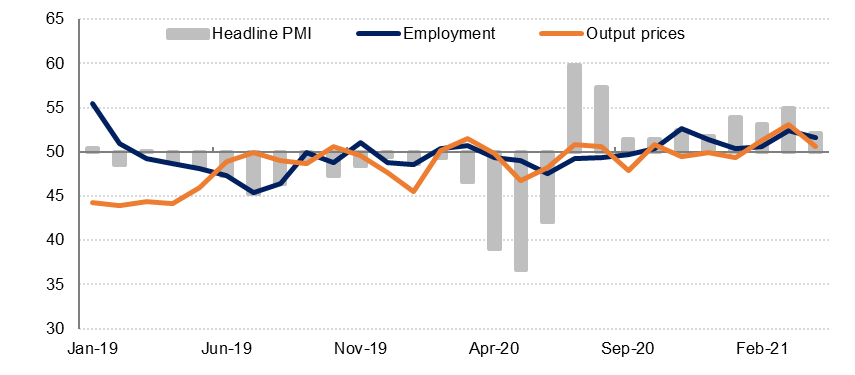 PMI survey data point to a solid recovery in the non-oil private sector in Q3 2021, with the headline PMI hitting an all-time high of 60.6 in Sept. The September reading of 58.2 was the highest since the series began in 2017, beating the previous record of 59.8 in July 2020. Output and new work and purchasing activity all gained momentum in Q3, while a sharp rise in employment did not prevent backlogs from accumulating. On a quarterly basis the PMI averaged 58.2 in Q3, beating the previous quarterly peak of 56.2 in Q3 2020. New business and total business activity both accelerated for 4 consecutive months into September. The rate of job creation was the fastest in 3 months and among the strongest recorded by the survey to date.