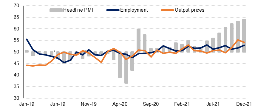 PMI survey data point to a continued recovery in the non-oil private sector in Q1 2021, with the headline PMI averaging 54.0. The March reading of 54.9 was the highest since the series began iin 2017. Output and new work growth gained momentum in Q1 21 and the survey indicated some growth in private sector jobs, albeit modest. There was little evidence of price pressure in the pipeline, unlike other GCC PMI surveys. Input costs actually declined slightly in Q1 and firms raised selling prices slightly as demand recovered. However, firms were still cautious about the outlook over the next twelve months.