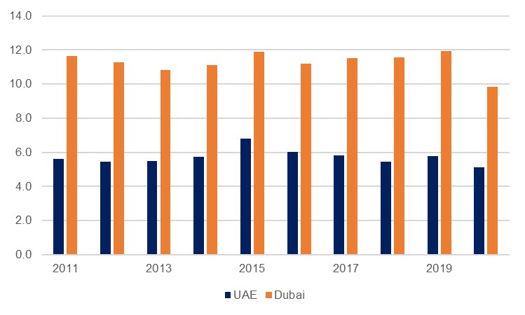 The transport and storage sector accounts for around 4.5% of the UAE’s GDP, down from a peak of 6.8% in 2015. For Dubai, the sector is even more meaningful as it produced 9.2% of GDP in 2021, although this was also down, from 11.6% over 2014-2016. While the share of output has shrunk in recent years this is likely a product of the as-yet incomplete recovery of global air travel since the pandemic rather than anything related to the freight transport sector. Transport and storage GDP shrank by around 30% in 2020 as global travel was paused but it has been steadily recovering since, and the freight component has likely underpinned this. Looking ahead, the slowdown in global trade threatens growth this year after the remarkable resilience of the sector through the pandemic: DP World chairman and CEO Sultan Ahmed bin Sulayem cautioned in March that there were multiple challenges facing global trade flows in 2023. Nevertheless, the UAE’s investment in the freight transport network will put the country in a position of relative strength compared with its peers.