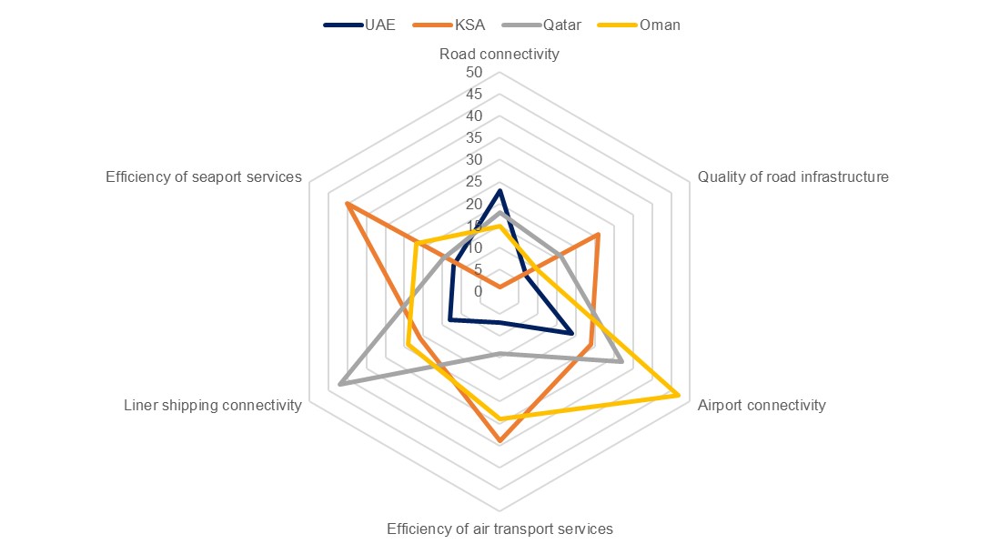 The ongoing investment in the infrastructure sector should also help maintain the UAE’s attractiveness as a place in which to invest and do business. The UAE’s transport sector is already ranked eighth in the world on the Global Competitiveness Index even before the new rail network is added into the mix, and this will encourage greater private and foreign investment in the country. It also adds to the attractiveness of the existing warehousing facilities and transhipment ports like Jebel Ali. As the sector develops at a faster rate the nascent rail network will also help bolster the UAE’s position relative to its regional peers as regional competition in some areas intensifies – the UAE currently ranks higher on almost every transport metric ranked by the World Economic Forum as compared with its GCC neighbours (see spider chart below).