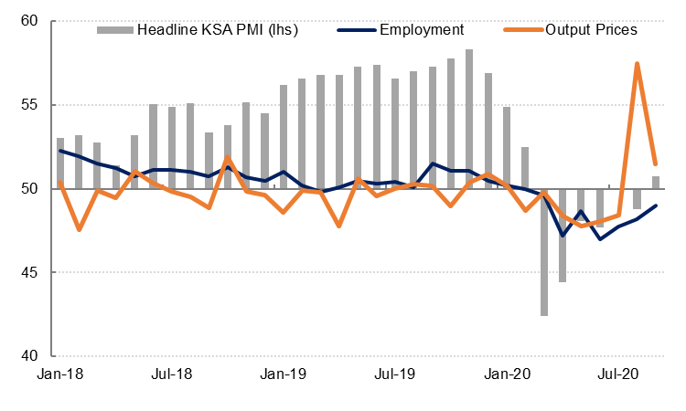 Saudi Arabia’s PMI rose to 50.7 in September from 48.8 in August, the highest reading since February. Private sector output and new orders increased for the first time since February, although the rate of growth was modest. Export orders also increased in September, by the most in a year. Despite the rise in output and new work, employment in the private sector declined again in September but at the slowest rate since March.