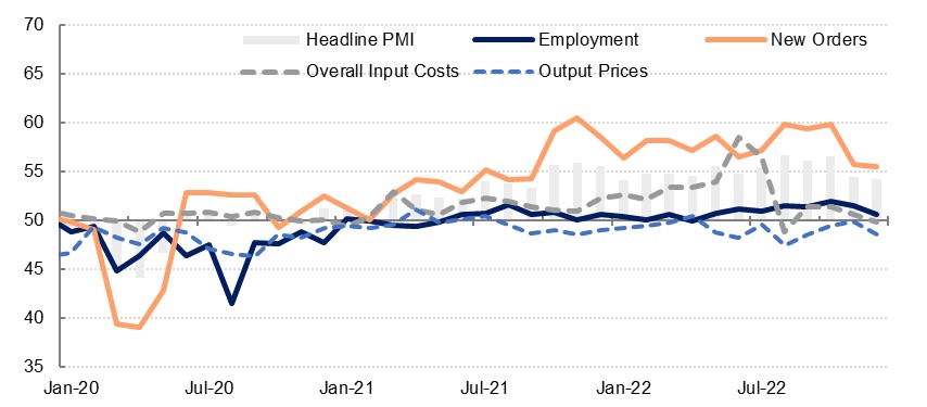 While firms were somewhat optimistic about the outlook over the next year, the future output index declined to its lowest level since February 2021 as firms fretted about the deteriorating global backdrop and what this could mean for their business activity in 2023. We expect non-oil sector growth to slow to 3.5% in the UAE this year from an estimated 5.6% in 2022.