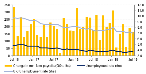 Meanwhile non-farm payroll report on Friday showed addition of 164k new jobs, clearly reflecting trend of slowing job gains albeit still well above the 100k new jobs per month required to maintain the unemployment level at around the 3.7% mark. While job gains in education, healthcare and financial services were solid, employment growth in the services sector was poor. Average hourly earnings grew at 0.3% m/m, indicating annualised gain of around 3.2% even though the six-month average gain in non-farm payrolls of circa 140k is at a seven year low. Also ISM manufacturing index fell again in July to a near-three year low of 51.2 from 51.7 in the previous month albeit still well in the expansionary territory.